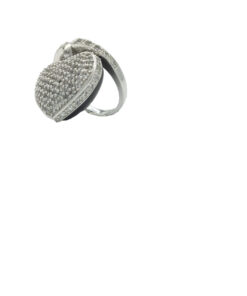 Anello in argento rodiato con ciondolo a forma di cuore double-face, zirconi da un lato, onice dall’altro